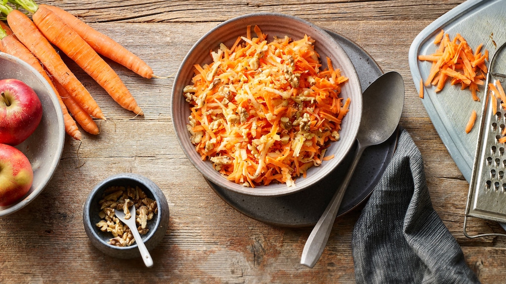 Ein außerordentlich gutes Team sind auch Apfel und Karotte. Daher landen die beiden in unserem Rezept für einen etwas anderen Salat. Möchten Sie den Apfel-Karotten-Salat als Hauptspeise genießen, empfehlen wir Ihnen, noch ein paar Fetawürfel unterzuheben und ihn mit Brot zu servieren.