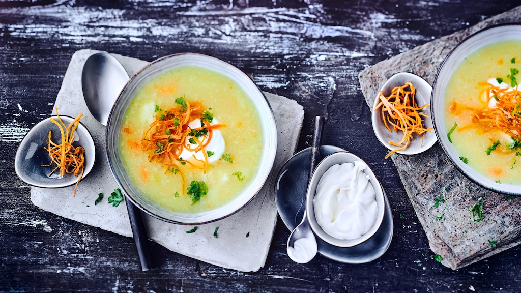 Wer sich fettarm und basisch ernährt, tut seinem Körper etwas Gutes. Daher werden Kohlsuppen auch oft zum Heilfasten verwendet. Die vorwiegend pflanzlichen Lebensmittel versorgen den Organismus mit vielen wichtigen Nährstoffen und halten den Säure-Basen-Haushalt im Gleichgewicht. Unser Rezept für Kartoffel-Blumenkohl-Suppe passt bestens in dieses Ernährungskonzept. Abgerundet mit einem Klecks Crème fraîche und dekorativem Karottenstroh macht die Suppe satt, ohne mit viel Kalorien zu Buche zu schlagen wie etwa ein deftiger Eintopf mit Wurst. Wer die Suppe noch leichter mag oder sich vegan ernährt, lässt die Crème fraîche einfach weg. Unsere Blumenkohlsuppe-Rezepte liefern Ihnen weitere Ideen für Low-Carb- und Low-Fat-Kreationen, die garantiert nicht dick machen. Zu dem milden Kohl passen die unterschiedlichsten Gewürze, und die Rezepte reichen von indisch mit Curry bis zu mediterran mit Rosmarin und Knoblauch. Eine Variation mit Muskat und Ei stellen wir Ihnen in unserem Blumenkohlsuppe-Rezept mit Garnelen als Einlage vor. Letztere stehen auch auf der Zutatenliste für das Rezept für Kartoffel-Ingwer-Suppe: eine mit Kurkuma, Zimt und Ingwer besonders raffiniert gewürzte Suppe. Besonders schnell ist unsere klassische Kartoffelsuppe aus dem Thermomix® zubereitet.
