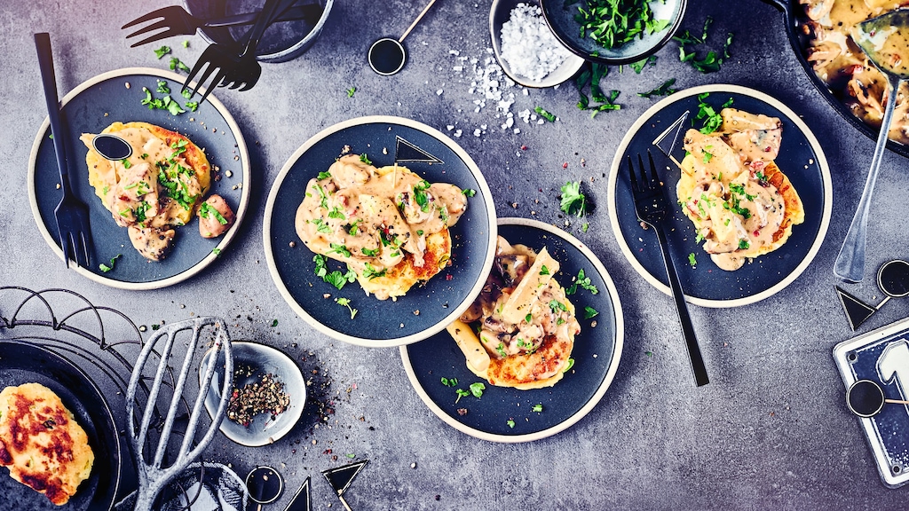 Schneller Kartoffelgenuss aus der Pfanne: Knusprige Kartoffel-Quark-Küchlein mit einer cremigen Champignon-Schwarzwurzel-Sauce.