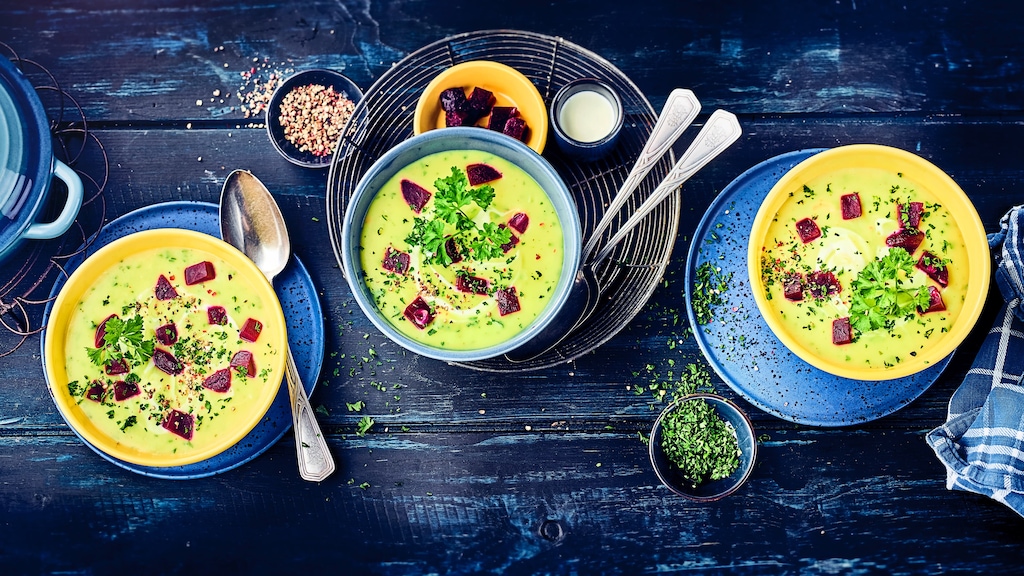 Tipp: Unser Kartoffelcremesuppe-Rezept ist vegetarisch, die Suppe schmeckt aber auch mit etwas angebratenem Speck oder würzigen Würstchen als Einlage besonders lecker. Für diese Kombination können Sie je nach persönlichem Geschmack auch auf die Rote Beete verzichten.