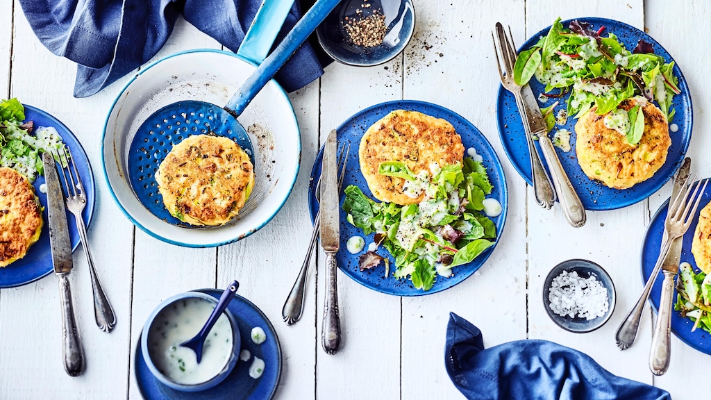 Unser Tipp für einen vegetarischen Snack: Selbstgebackene Kartoffelküchlein aus Maisgrieß und Cashewkernen mit einem Salat an Joghurt-Zitronen-Dressing!