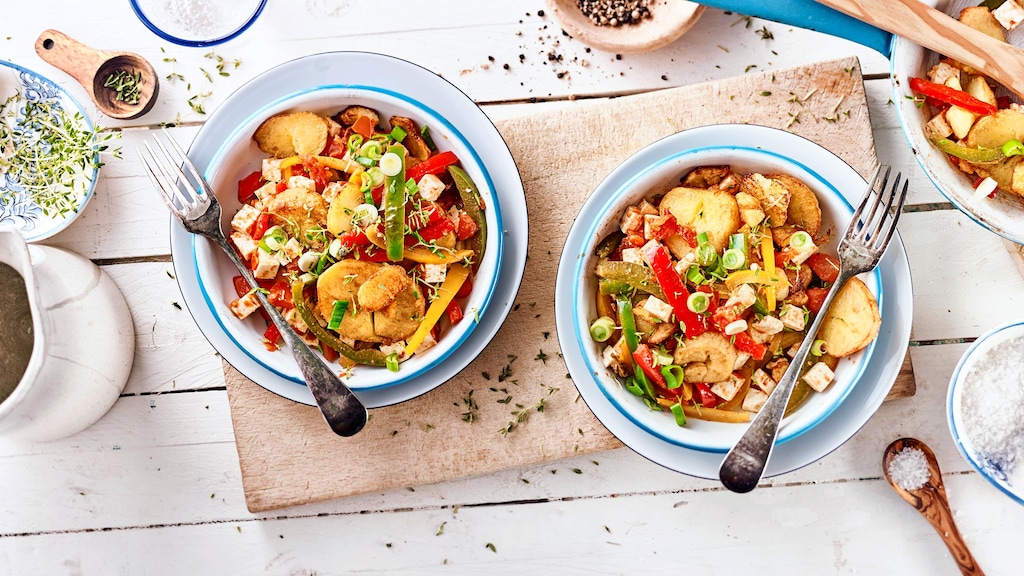 Kartoffelpfannen-Rezepte gibt es in vielen Varianten: mit Schafskäse, Schinken oder Räuchertofu ebenso gut wie mit Fisch. Für unserer Kartoffelpfanne mit Feta verwenden Sie beispielsweise unterschiedliche, bunte Paprikasorten.