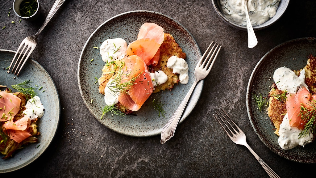 Warum? Weil die darin enthaltene Stärke maßgeblich für das Gelingen ist. Sie hält die rohen Kartoffeln zusammen und ist somit die Voraussetzung für knusprige Kartoffelpuffer. Zu weich sollte die Teigmischung allerdings auch nicht sein. Daher verwenden Sie für unsere Kartoffelpuffer mit Lachs vorwiegend festkochende Kartoffeln. Die besitzen einerseits genügend Stärke, andererseits noch einen gewissen Biss und lassen sich daher wunderbar reiben. Perfekt für unser Rezept. Denn es leitet Sie an, wie Sie sowohl die Kartoffelpuffer mit Lachs als auch den Dip komplett selbst zubereiten. So nutzen Sie für die kleinen Küchlein neben Kartoffelraspeln Zwiebeln, Ei und Gewürze, darunter auch Muskatnuss, sowie Weizenmehl. Letzteres wird für Kartoffelpuffer – als Beilage oder Hauptgericht – häufig durch Haferflocken ersetzt. Unsere Kartoffelpuffer garnieren Sie außerdem mit Räucherlachs, den Sie zusätzlich mit Schnittlauch verfeinern. Und apropos Räucherlachs: probieren Sie unbedingt auch unser Rezept für Blätterteigschnecken mit Lachs! Ein wichtiger Faktor ist darüber hinaus das Öl. Sie brauchen reichlich davon: Nehmen Sie, wie für unsere Lachsfrikadellen, eines mit hohem Rauchpunkt, beispielsweise Raps- oder Sonnenblumenöl. Raffiniertes Olivenöl ist ebenfalls eine Option. Wie Sie Kartoffelpuffer schön knusprig bekommen, verraten unsere EDEKA-Experten.