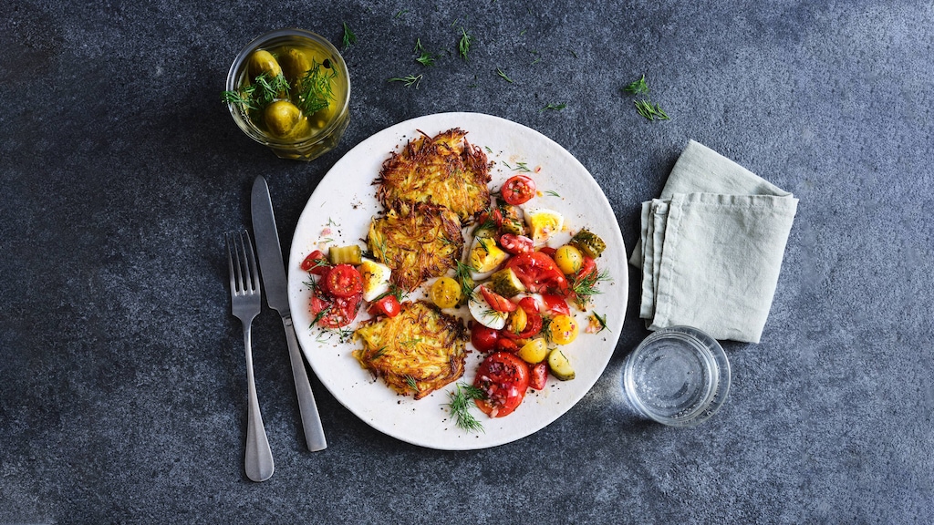 Knusprige Kartoffelrösti mit einem leckeren Salat aus Tomaten und Gewürzgurken: Alles was Sie brauchen sind 30 Minuten und 5 Zutaten sowie ein paar Kleinigkeiten aus dem Vorratsschrank.