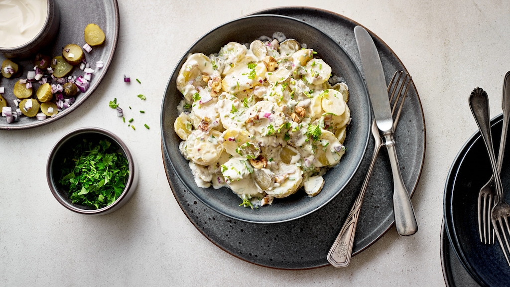 Ein besonders cremiges Dressing, geröstete Walnüsse und frische Kräuter zeichnen diesen köstlichen Kartoffelsalat mit Creme fraîche aus. Lassen Sie sich von der Kartoffel verführen!