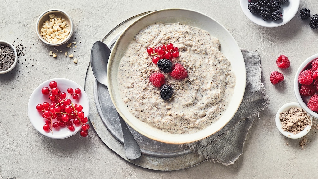 Ketogen ernähren geht auch beim Frühstück: Selbstgemachtes Keto-Porridge mit Chiasamen, Cashewkernen und Haferkleie. Dazu passen zum Beispiel ein paar frische Beeren.