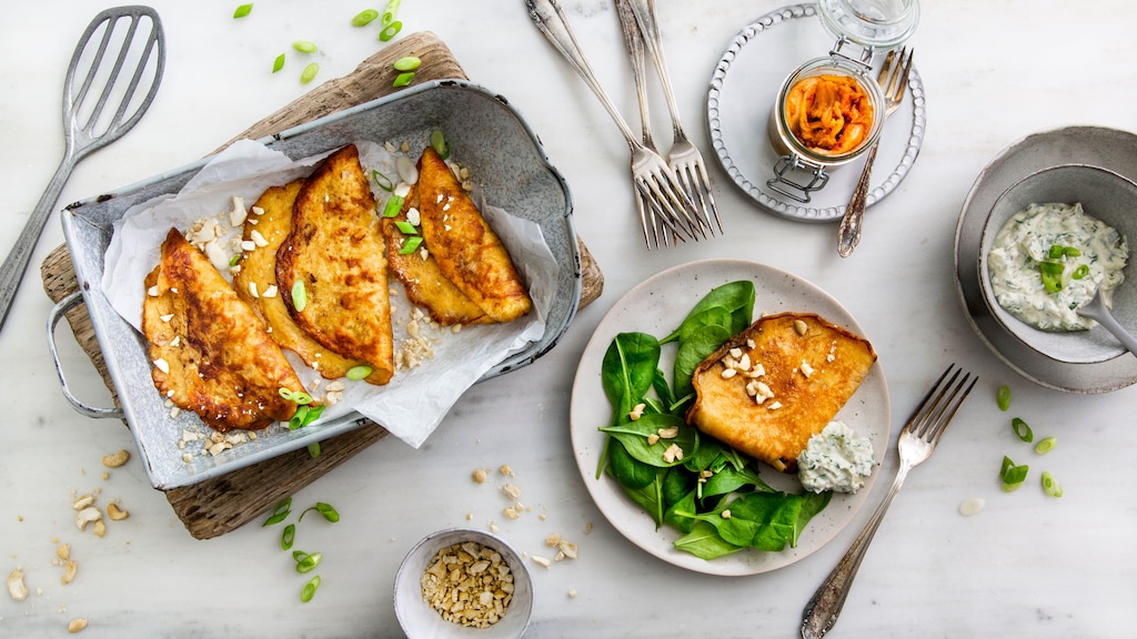 Die fertigen Pancakes auf dem Blattspinat anrichten und gemeinsam mit dem Dip und den Cashewkernen servieren.