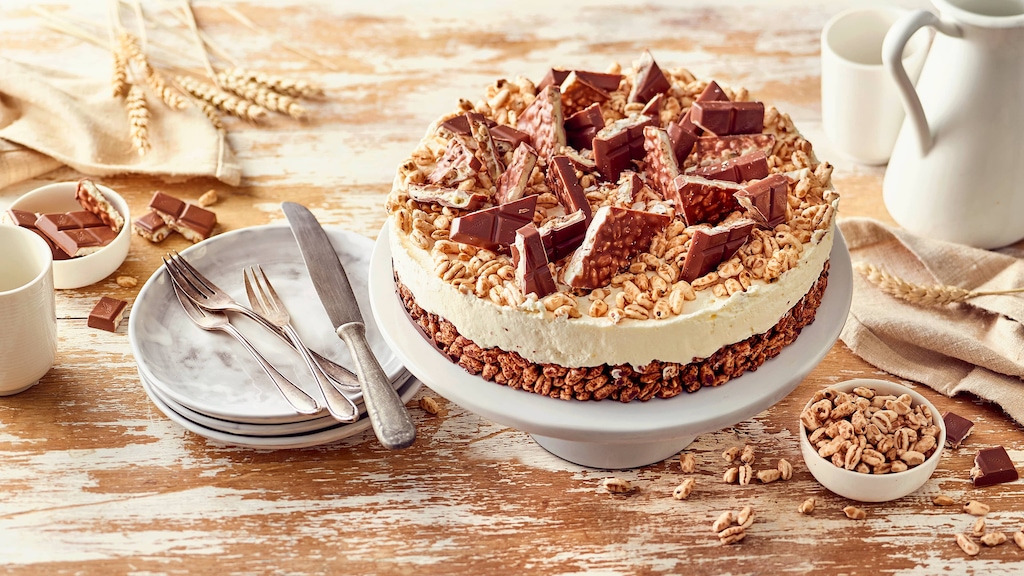 Die Torte auf eine Kuchenplatte ziehen und vorsichtig aus dem Tortenring lösen. Kinder-Country mit einem scharfen Messer in grobe Stücke schneiden und dekorativ auf der Torte verteilen. Mit gepufftem Weizen garnieren und servieren.