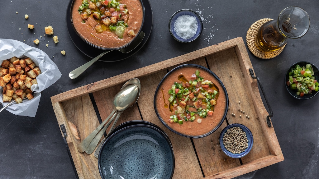 Immer öfter steigen die Temperaturen im Sommer auf über 30 Grad. Da sind kalte Gerichte aus der Mittelmeerküche wie eine klassische spanische Gazpacho genau das Richtige. Die andalusische Sommersuppe ist nahrhaft, erfrischend und einfach köstlich. Die Ursprünge der wohl bekanntesten spanischen Suppe gehen auf die Mauren zurück, die Andalusien 800 Jahre lang prägten. Heute wird sie im tiefen Süden Spaniens vor allem in den heißen Sommermonaten Juli und August serviert – als Vorspeise oder Hauptgericht.