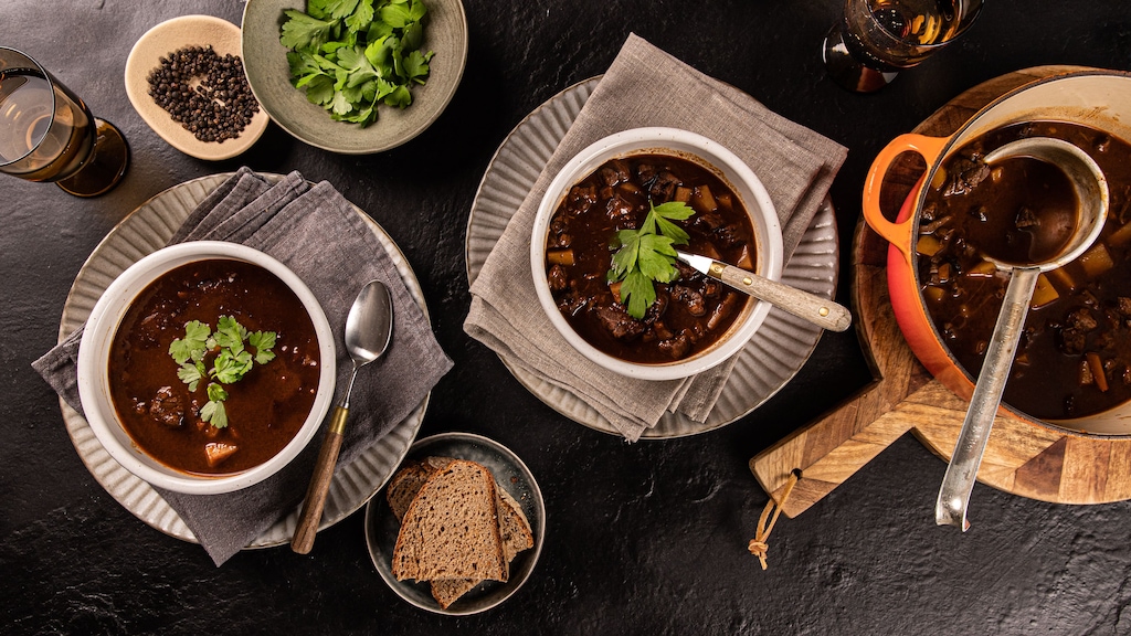 Weitere Grundzutaten für eine klassische Gulaschsuppe sind Zwiebeln, Paprikamark, Kartoffeln und trockener Rotwein. Als Gewürze kommen unter anderem Lorbeer, Thymian und Paprikapulver zum Einsatz. Natürlich können Sie nach Belieben variieren. Wie wäre es zum Beispiel mit Kümmel, gehackten Paprikaschoten oder einer Prise Chili – oder unserer fruchtigen Gulaschsuppe mit getrockneten Aprikosen und Kürbis?