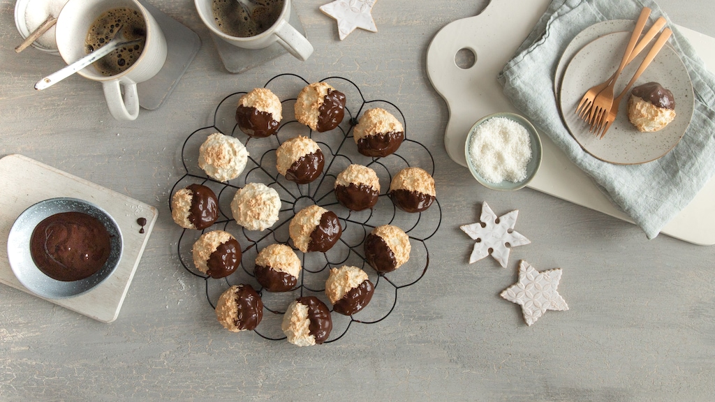 Ein Klassiker aus der Weihnachtsbackstube sind luftig-leichte Kokosmakronen. Das feine Gebäck ist auch eine tolle Rezeptidee für glutenfreie Weihnachtsplätzchen, wenn Sie sie ohne Oblaten backen. Mit exotischem Kokosaroma und süßer Schokohaube – einfach lecker!