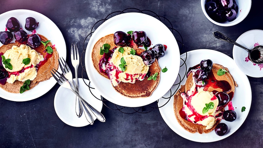 Leckeres Dessert: Bereiten Sie unsere kleinen Pfannküchle mit Eis aus Dinkelmehl und mit Ingwer zu. Dazu reichen Sie heiße Kirschen und Eis – in 35 Minuten fertig!
