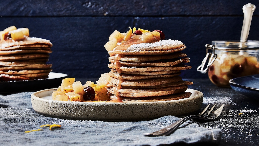 Der Teig in unserem Quarkpfannkuchen-Rezept besteht aus Eiern, Dinkelvollkornmehl, gemahlenen Haselnüssen sowie Milch und Quark und wird sowohl gezuckert als auch gesalzen. Ein Birnenkompott mit Zimt, Anis und Cranberrys ist der perfekte Begleiter. Alternativ können Sie auch mit unserem Birnenkompott-Rezept ein köstliches Mus mit feiner Ingwerschärfe zu den Pfannkuchen reichen. In gerade einmal 30 Minuten erhalten Sie so eine Mahlzeit, die ausgewogen und kalorienarm ist – eine Portion hat nur 262 Kalorien. Das Quarkpfannkuchen-Rezept ohne süße Beilage bietet sich auch an, wenn Sie sich low carb ernähren, denn der Kohlenhydratanteil lässt sich ganz einfach im Verhältnis zum Eiweißanteil reduzieren: Quark, Eier und Haselnüsse stecken voller Proteine und das kohlenhydratreiche Dinkelvollkornmehl können Sie beispielsweise durch Mandelmehl ersetzen.