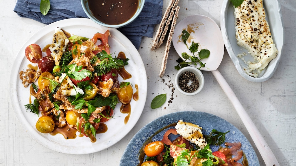 Knäckebrot mal anders – als Salat mit Tomaten, Lauchzwiebeln, Parmesan und Kräuterdressing. Und als griechisches Topping: gegrillter Feta.