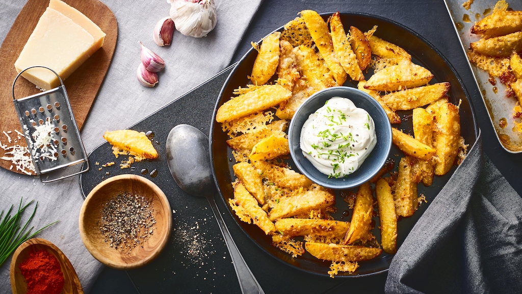 Alles, was Sie tun müssen, ist Kartoffeln zu schälen und zu vierteln, zu würzen und in den Ofen zu geben. Während sie garen und schön knusprig werden, reiben Sie den Parmesan und streuen ihn etwa nach der Hälfte der Backzeit über die Kartoffeln. In unserem Rezept servieren wir die Knoblauch-Kartoffeln mit Parmesan dann mit Kräuterquark oder Sour Cream. Hervorragend kombinieren lassen sich die aromatischen Knusperkartoffeln ebenso gut zu einem Salat, einer Gemüsepfanne, gebackenem Feta, Räucherlachs oder Grillfleisch.