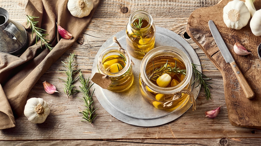 Wir verwenden für unser Rezept zum Knoblauchöl selber machen hochwertiges Olivenöl als Basis. Die beiden Zutaten harmonieren perfekt miteinander. Nicht ohne Grund wird in unterschiedlichsten Rezepten frischer Knoblauch in Olivenöl angeschwitzt. Aber auch aus anderen Ölsorten können Sie Knoblauchöl selbst herstellen. Für eine geschmacklich neutralere Version verwenden Sie beispielsweise Raps- oder Sonnenblumenöl. Diese haben zudem den Vorteil, dass Sie sie deutlich stärker erhitzen können als Olivenöl. Möchten Sie Ihr Knoblauchöl verwenden, um damit etwas anzubraten, ist ein Öl mit hohem Rauchpunkt die bessere Wahl. Kochen Sie häufig asiatische Gerichte, sind auch Erdnuss- oder Sesamöl eine passende Basis für die Verfeinerung mit Knoblauch. In jedem Fall gilt: Wenn Sie Knoblauchöl selber machen, bleibt dieses so lange haltbar wie das Öl, das Sie dafür verwendet haben. Füllen Sie es am besten in eine dunkle Glasflasche ab und lagern Sie es in der Speisekammer oder im Küchenschrank, um es vor Licht zu schützen.