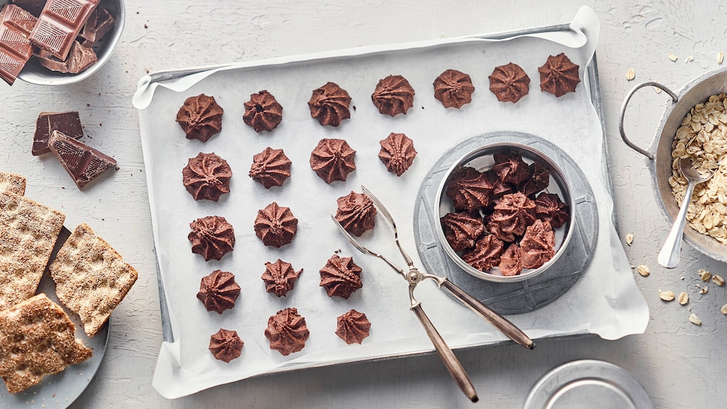Mit einem Spritzbeutel (Sterntülle nr.8) Schokomasse entnehmen und zu kleinen Häufchen auf ein mit Backpapier ausgelegtes Blech geben. Bei Raumtemperatur vollständig trocknen lassen.