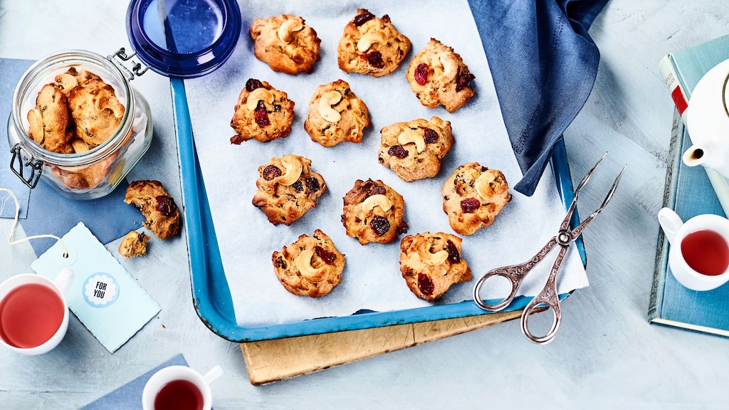 Kleine Energielieferanten für Ihre Kaffeepause: Probieren Sie unsere Fruchtplätzchen aus getrockneten Aprikosen, Cranberries, Mandeln und Cashewkernen!