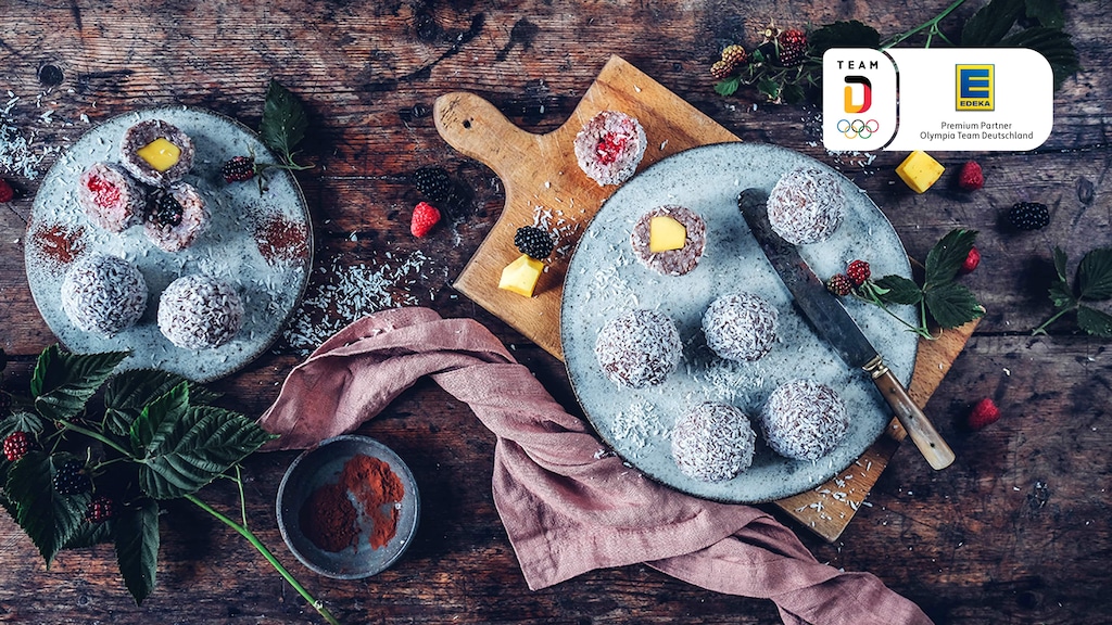 Mit angefeuchteten Händen aus dem Milchreis 12 handflächengroße Bällchen formen, eine Mulde hineindrücken und abwechselnd die Früchte vorsichtig eindrücken. Dabei die Reisbällchen mit Mango, Brombeere und Himbeere jeweils getrennt voneinander bearbeiten. Mit Milchreis verschließen und die Bällchen durch die Kokosraspel rollen. Pro Person jeweils ein Kokos-Reisbällchen mit je einer Fruchtsorte servieren.