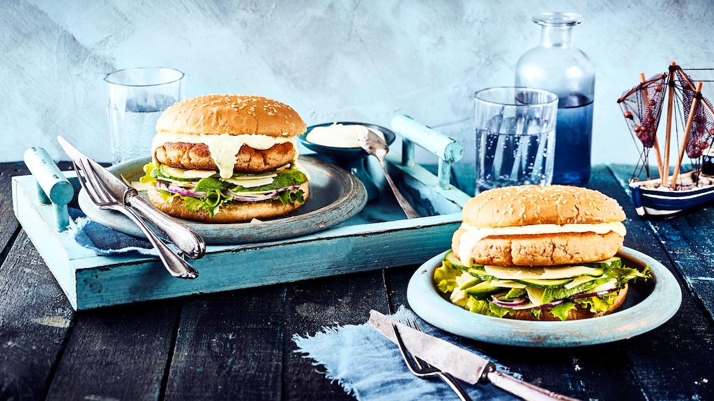 Jeweils die untere Brötchenhälfte mit Salatblatt, Avocado, Krabben-Patty, Zwiebeln, Gurke und gehobeltem Parmesan belegen. Die obere Hälfte dick mit Burger-Sauce bestreichen und auflegen.
