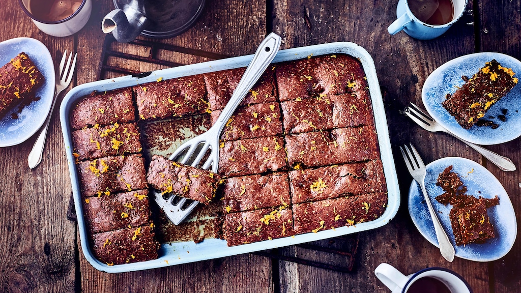 Ein kleines Backblech mit Backpapier auskleiden und den Brownieteig hineingeben. Die Brownies für 25-30 Minuten bei 165 °C Umluft oder 175 °C Ober/-Unterhitze backen. Die Orange abreiben und die Brownies je nach Geschmack mit der abgeriebenen Schale garnieren.