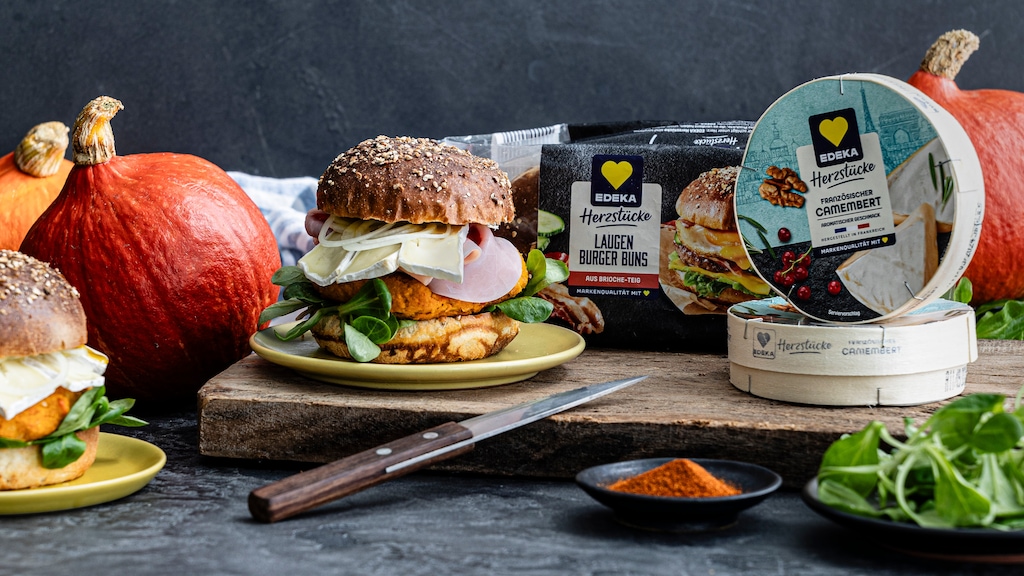 In der Zwischenzeit bereiten Sie in Ruhe die Soße und den Belag vor. Auch hier besteht natürlich Spielraum. Wer statt Weichkäse lieber klassischen Gouda oder Schmelzkäse bevorzugt, kann auch diesen verwenden. Und auch für den Schinken gibt es leckere Alternativen. Rustikaler und deftiger wird der Kürbis-Burger mit Speck oder als fleischlose Option mit Räuchertofu. Variieren Sie auch bei den übrigen Zutaten: Radicchio oder Rucola etwa bringen eine leicht bittere Note in den Kürbis-Burger. Die Senf-Öl-Soße kann einer klassischen Tomatensoße weichen, die mit Chili schön feurig wird.