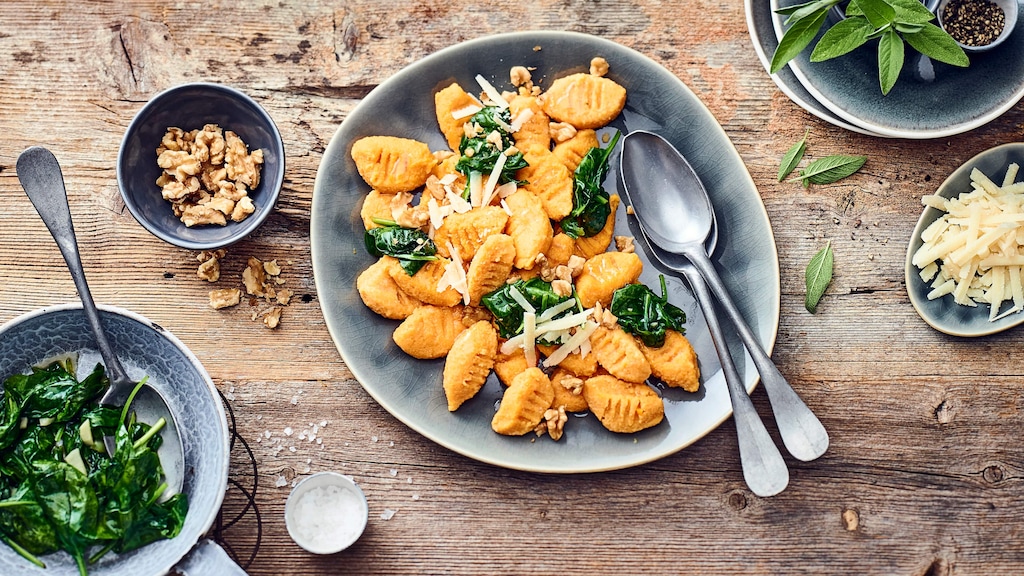 Kürbis-Gnocchi mit in Butter geschwenktem Knoblauch, Spinat und gerösteten Walnüssen anrichten. Mit gehobeltem Parmesan und Salbeiblättern garniert servieren.