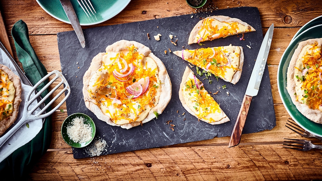 Probieren Sie unser Rezept für selbst gemachte Zwiebelküchle mit Hokkaido-Kürbis, frischen Majoranblättchen, Rauchsalz und roten Zwiebeln aus.