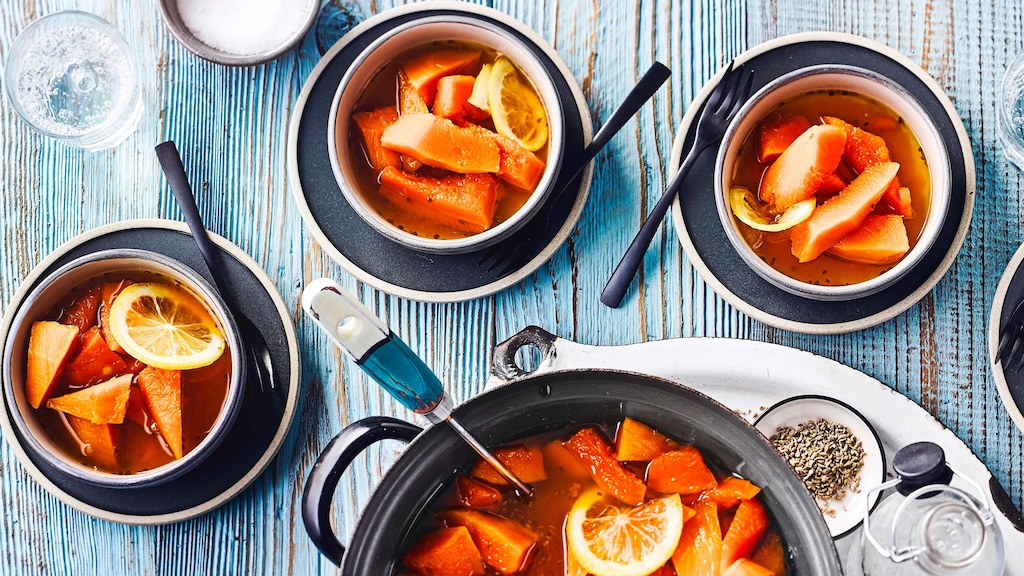 Kürbiscremesuppe, Kürbiskuchen, Kürbisbrot, Kürbismarmelade, Kürbis-Chutney: Das Spektrum an feinen Speisen aus dem Fruchtgemüse ist groß. Nutzen Sie die Saison zwischen September und November, um die ganze Genusspalette der farb- und geschmacksintensiven Kürbissorten kennenzulernen. Achten Sie jedoch darauf, für den Verzehr nur essbare Kürbisse zu verwenden. Neben herzhaften Speisen wie Kürbisgratin oder Kürbisquiche sind es vor allem süße Kürbisgerichte, die den Herbst kulinarisch begleiten und bereichern. Kürbis-Muffins oder Kürbis-Brownies als Dessert oder zum Kaffee sowie Kürbiskonfitüre als Brotaufstrich sind typische Vertreter. Auch unser Kürbiskompott-Rezept fällt in diese Kategorie. Zitrone und Anis verleihen diesem Fruchtgenuss eine erfrischende Note. Das Kompott lässt sich pur genießen, aber auch zu Süßspeisen wie Grießauflauf oder Pfannkuchen sowie zu Fleisch- und Fischgerichten. In einem verschlossenen Glas hält es sich etwa eine Woche im Kühlschrank.