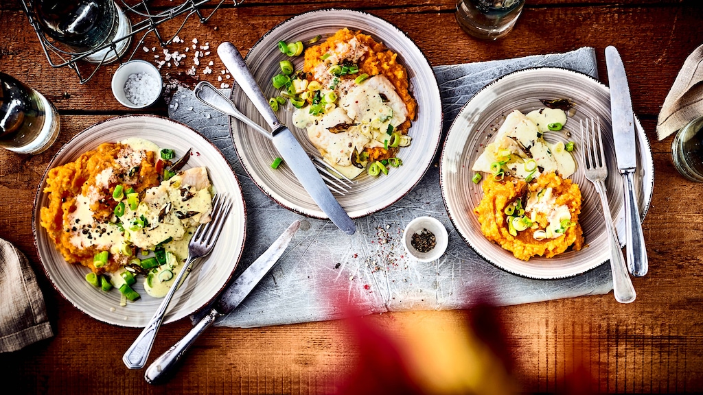 In diesem Kürbispüree-Rezept werden übrigens zusammen mit den klein geschnittenen Kürbisstücken auch Kartoffeln gekocht und püriert. So wird die cremige Beilage ganz besonders sämig und darüber hinaus angenehm sättigend. Für die Extraportion Raffinesse sorgt das Fischfilet, das in gedünsteten Frühlingszwiebeln angebraten und mit einer pikant-fruchtigen Frischkäse-Orangen-Soße serviert wird. Keine Frage: Dies ist eines jener Fischgerichte, bei denen Gäste ganz bestimmt nach dem Rezept fragen. Das gilt auch für unser Saiblingfilet-Rezept in Senfsoße an karamellisiertem Möhrengemüse und Spinat-Kartoffelstampf.