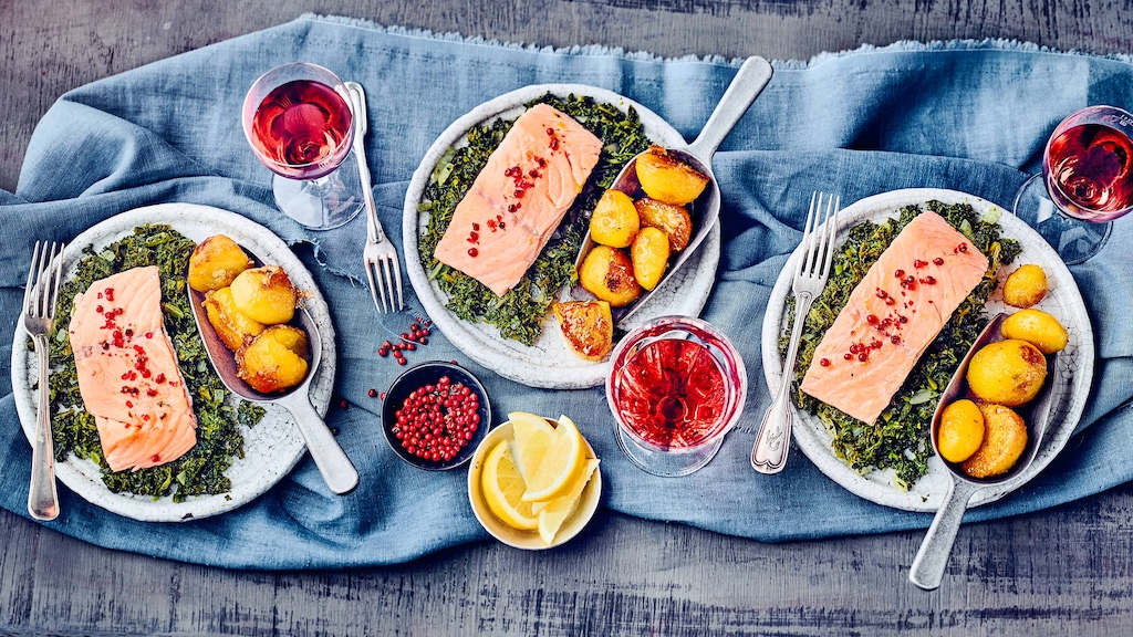 Probieren Sie einmal unsere Variante dieses Traditionsgerichts aus dem Norden Deutschlands: Gedünstete Tranchen von Lachs auf Grünkohl-Gemüse mit karamellisierten Kartoffeln – deftig und lecker!