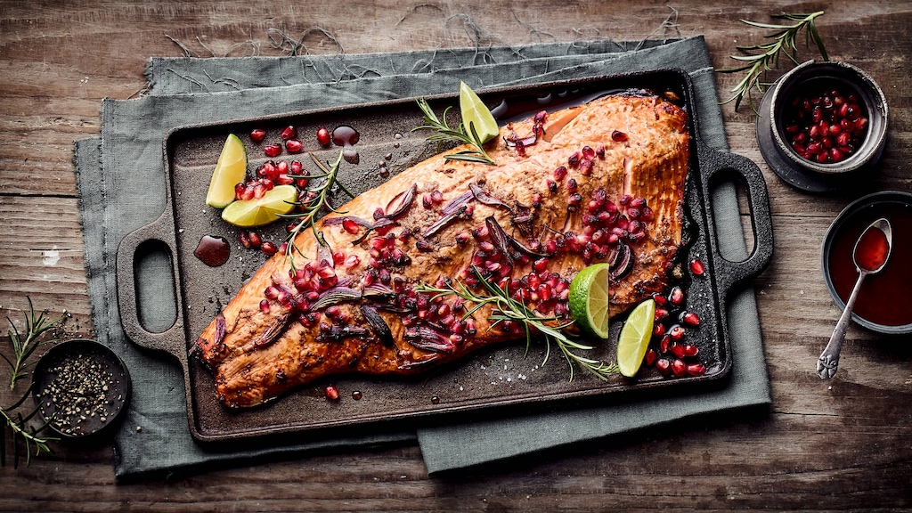 Der Lachs mit Granatapfel-Sojasoße-Marinade ist der Star bei jedem Essen.