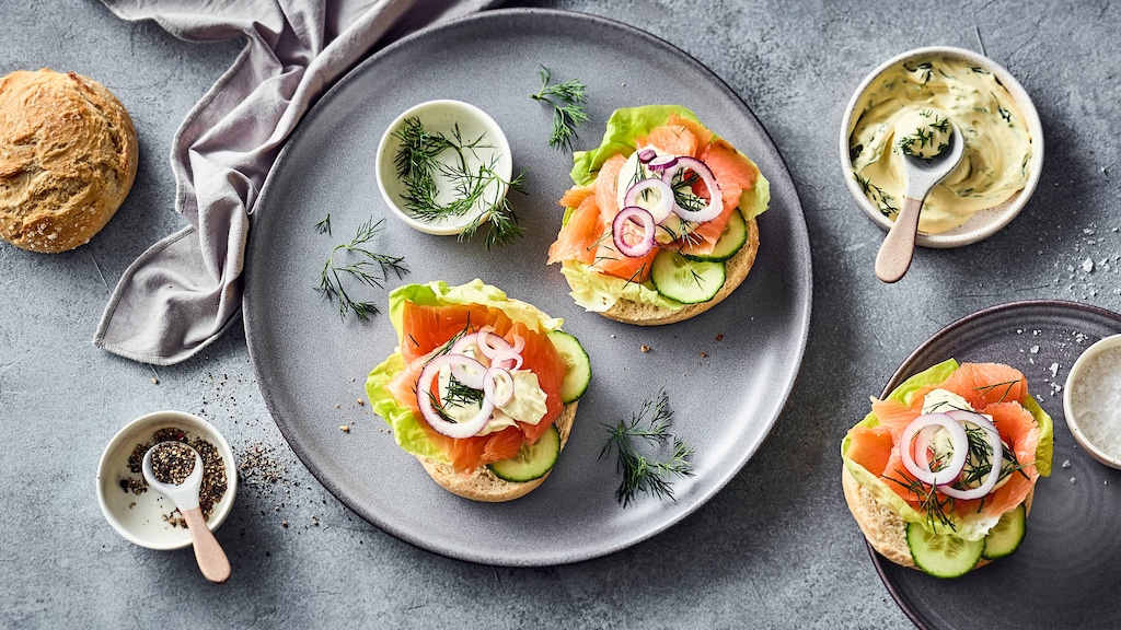 Wenn Sie unser Rezept nutzen, um Lachsbrötchen selber zu machen, verwenden Sie Räucherlachs. Dieser bringt sein charakteristisches, rauchiges Aroma mit. Vor allem können Sie ihn roh verzehren – und das sorgt dafür, dass das köstliche Brötchen noch schneller gelingt. Denn Sie benötigen lediglich zehn Minuten, um unser Lachsbrötchen zu belegen. Den Aufstrich stellen Sie ebenfalls selbst her und nutzen hierfür Schmand, Frischkäse, Senf und Dill. Mit diesen Zutaten rühren Sie für unser Lachsbrötchen mit Frischkäse eine vielseitige Creme an, deren Aroma wunderbar zum Fisch passt. Salat und Gurken runden das Ganze ab. Wenn Sie möchten, können Sie unser Lachsbrötchen zusätzlich mit Zwiebeln garnieren. Diese sind zwar nicht Teil des Rezepts, aber harmonieren dennoch hervorragend dazu.