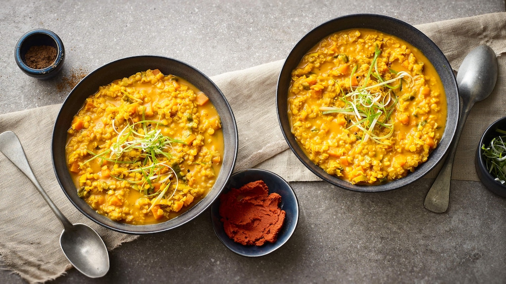 Entdecken Sie die Vielfalt der asiatisch inspirierten Küche und bereiten Sie unser Linsen-Kokos-Curry-Rezept mit roten Linsen, Ingwer, Lauch, Möhren, Knoblauch und Kokosmilch zu. Das schmeckt nicht nur super – es geht auch super einfach!