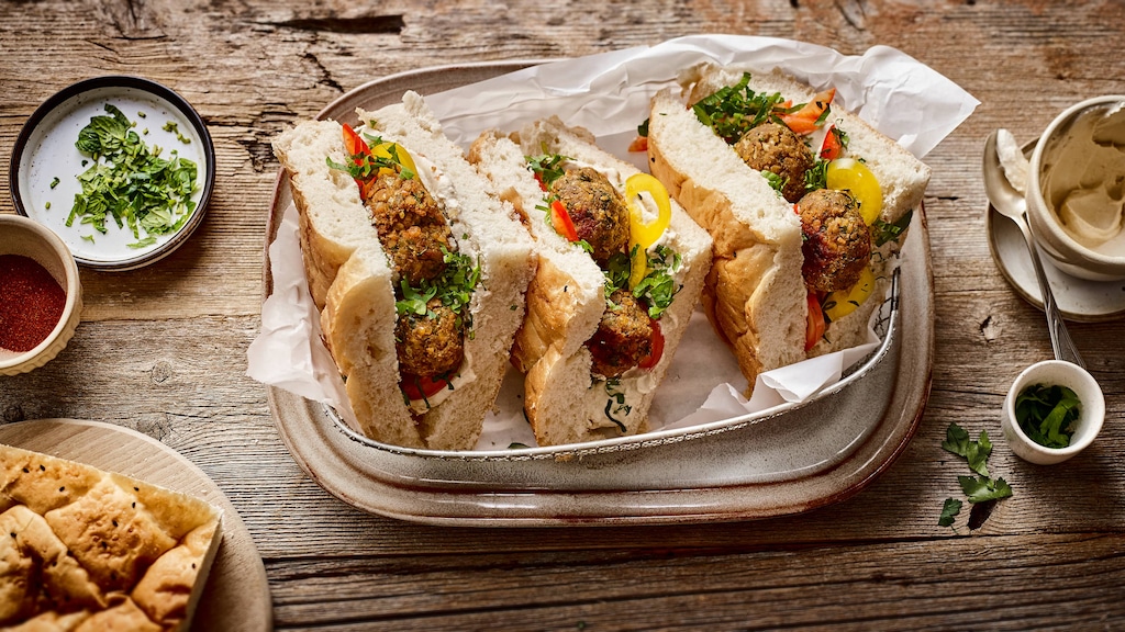 Orientalisches Linsen-Kräuter-Bällchen-Sandwich mit Paprika und Sesam-Joghurt-Soße.