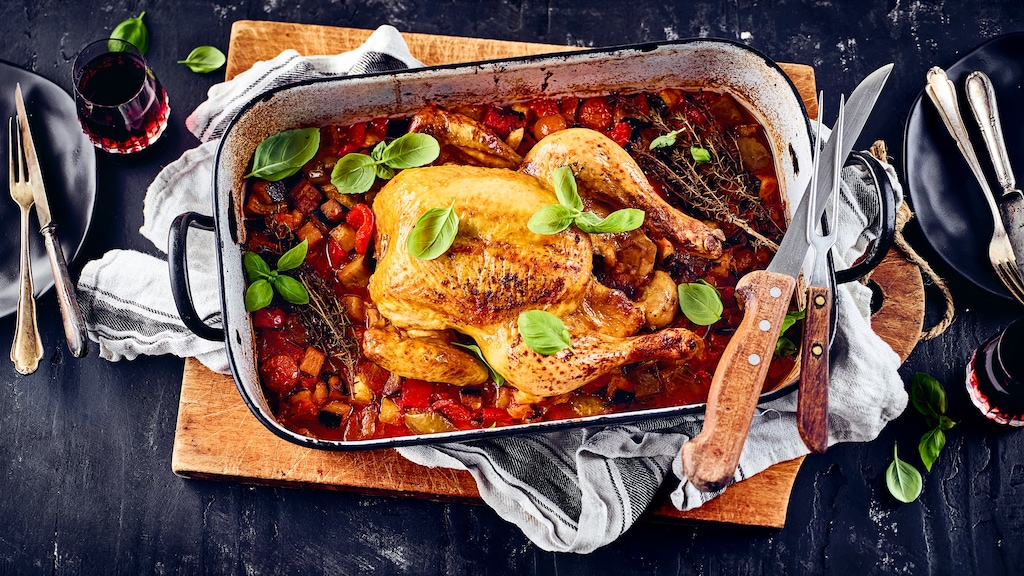 Ausschlaggebend für den Geschmack des Maishähnchens ist aber letztendlich die Marinade. Bestreichen Sie das Huhn vor dem Garen großzügig mit einer Mischung aus Olivenöl, Honig, Tomatenmark und Paprikapulver. So kann sich die Haut während des Backvorgangs damit vollsaugen. Als Beilage rundet mediterranes Gemüse Ihr Gericht perfekt ab. Wir verwenden in unserem Rezept Paprika, Zucchini, Oliven und Kapern. Doch hier können Sie Ihrem Geschmack freien Lauf lassen. Aubergine, Brokkoli und Kartoffeln beispielsweise eignen sich genauso gut als Beilage zum Hähnchen. Geben Sie das Gemüse entweder auf ein extra Blech oder garen Sie es zusammen mit dem Maishähnchen im Bräter wie in unserem Rezept für Paprika-Hähnchen. Zartes Brustfilet in einer Tomaten-Paprika-Soße auf Vollkornspaghetti servieren Sie mithilfe unseres Rezepts für Hähnchen-Geschnetzeltes.
