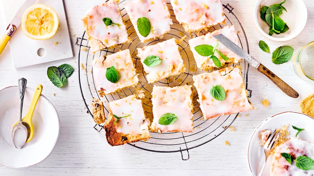 Den Kuchen portionieren und nach Beliebe mit Zitronenabrieb und frischen Minzblättern servieren.
