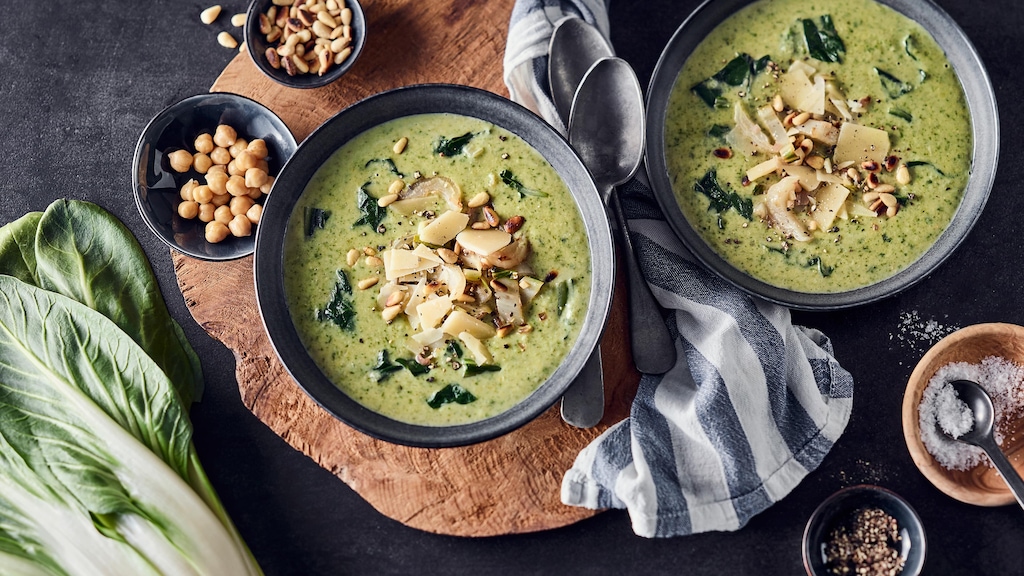 Überraschen Sie Ihre Familie oder Freunde mit unserer cremigen Mangoldsuppe. Mit ihrem raffinierten Topping aus gerösteten Pinienkernen und gehobeltem Parmesan ist sie nicht alltäglich und superlecker!