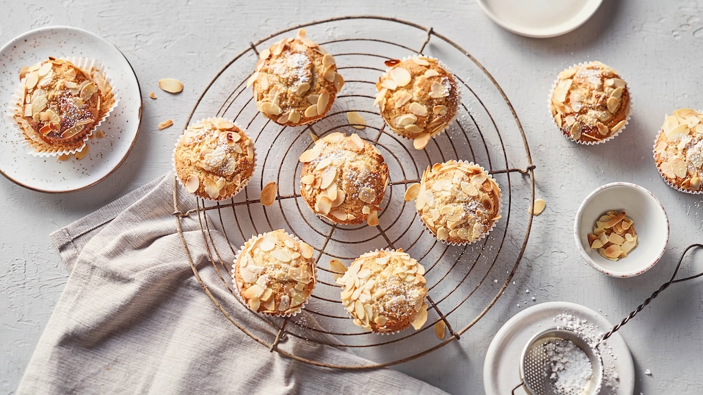 Der optische Feinschliff geht ebenfalls flott von der Hand. Gehobelte Mandeln bilden das Topping, sie werden einfach vor dem Backen leicht in den Teig gedrückt. Wer möchte, kann den letzten Arbeitsschritt bei unserem Marzipan-Muffins-Rezept aber auch kunstvoller gestalten. Dekorieren Sie die Muffins mit Marzipan, sind der Fantasie kaum Grenzen gesetzt. Die Bandbreite reicht von Blumen über Weihnachtsmänner bis hin zu Halloween-Motiven – so lässt sich das Gebäck wunderbar saisonal anpassen.