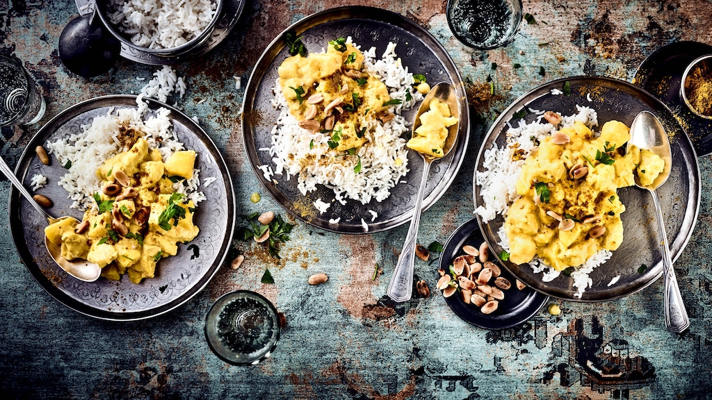 Massaman Curry mit Reis und gerösteten Erdnüssen anrichten. Mit frischen Korianderblättern und Limettenscheiben garniert servieren.