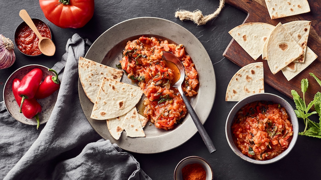 Matbucha ist ein beliebter Vorspeisendip und wird aus Tomate, Paprika, Knoblauch, Olivenöl und Gewürzen zubereitet. Die Wurzeln dieser aromatischen Gemüsepaste liegen am Mittelmeer – wo genau, scheint nicht ganz klar zu verorten. Fest steht: Matbucha landet sowohl in Israel sowie in Marokko und Spanien auf dem Teller. Außerdem ist die Tomatensalsa Bestandteil der Levante-Küche und wird als Mezze serviert.