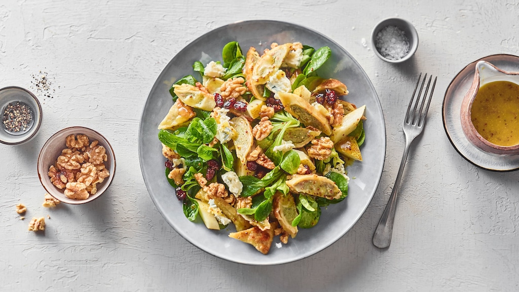 Feldsalat, Maultaschen, Birne, Blauschimmelkäse, Walnüsse und Cranberries mit dem Dressing in einer Schüssel vermengen und auf Tellern anrichten.
