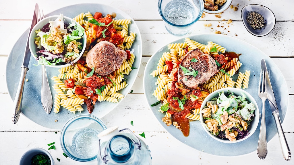 Eine Gemüsepfanne wie unsere Zucchinipfanne mit Medaillons ist immer eine gute Wahl. Das Rezept ist vielfältig und flexibel, Sie können ohne große Probleme genug Essen auch für viele Gäste anbieten, falls es nötig ist. Das Praktische: Sie garen die Zutaten nach und nach alle in der Pfanne, die Nudeln kochen Sie natürlich vorher. Sollten Sie nicht so gerne Pasta essen oder haben keine im Haus, lässt sich alternativ zum Beispiel Reis verwenden. So gelingt eine komplette Mahlzeit in einer halben Stunde, mit zartem Schweinefleisch, einer raffinierten Käse-Tomatensoße, Gemüse und Salat als Beilage.