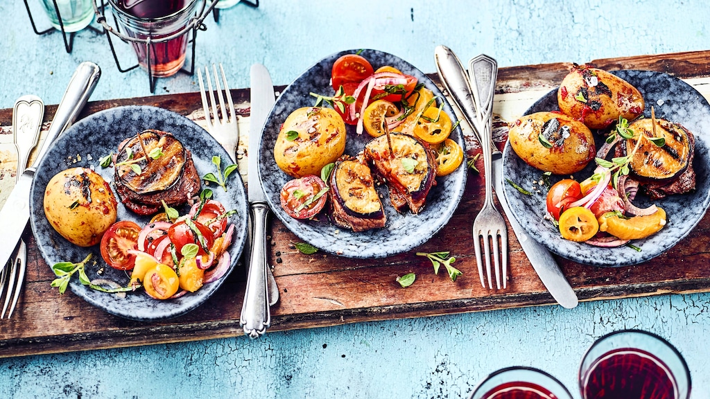 Probieren Sie unser mediterranes Grillmenü-Rezept aus: Feine Lammhüfte mit Auberginen und Majorankartoffeln, dazu ein Tomaten-Aprikosen-Salat!