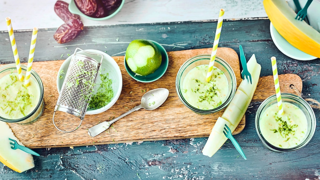 Limette heiß abspülen, 1 TL Schale abreiben und Saft auspressen. Melonen- und Avocadofruchtfleisch mit den übrigen Zutaten in einer hohen Rührschüssel pürieren und genießen.