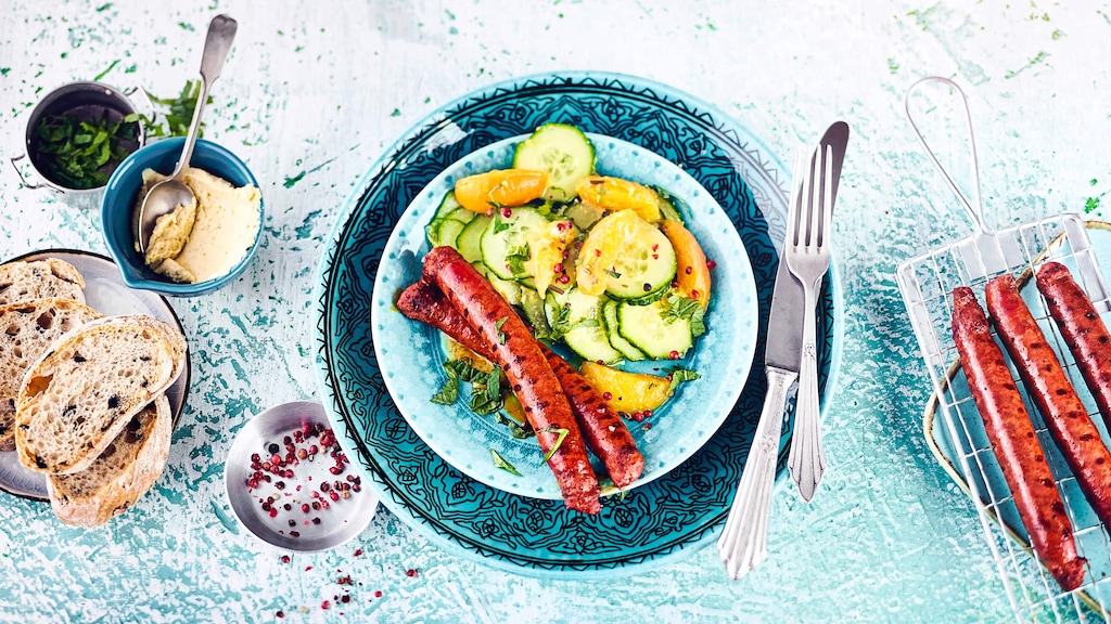 Zusammen mit dem delikaten Dressing – verfeinert mit Zitrusfrüchten, Pfirsich und Hummus – und den frischen Gurken wird die Merguez nach unserem Rezept zum Höhepunkt des Tages! Servieren Sie die Köstlichkeit auch als Tapas Freunden und Familie.