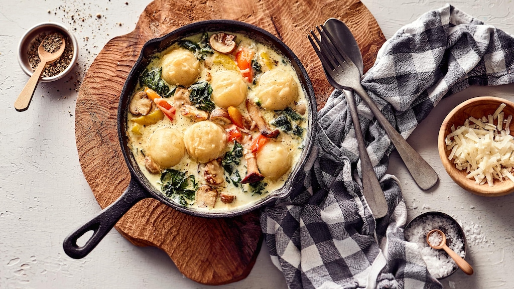 Mit cremiger Soße und lecker überbacken: Unser Rezept für eine Mini-Knödel-Pfanne mit allerlei Gemüse, kleinen Mini-Knödeln und Parmesan.