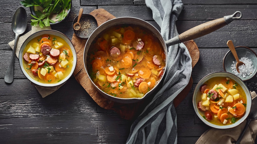Wenn’s draußen kalt und ungemütlich ist, wärmt unser deftiger Möhreneintopf mit viel Gemüse und Mettenden von innen. Noch dazu schmeckt er wie bei Oma! Vorgekocht und portionsweise eingefroren, der perfekte Wintervorrat.