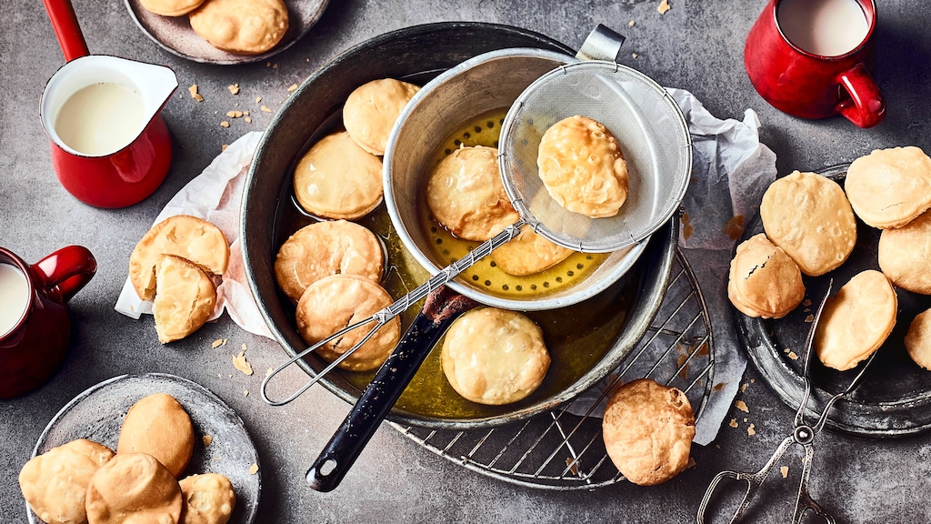 Teig nochmals gut durchkneten, etwa 1 cm dick ausrollen und zu Kreisen ausstechen. Teigkreise dick einrollen und zu Schupfnudeln formen. Öl in einem großen Topf oder einer Pfanne erhitzen und die Teiglinge goldbraun frittieren. Auf Küchenpapier abtropfen lassen.