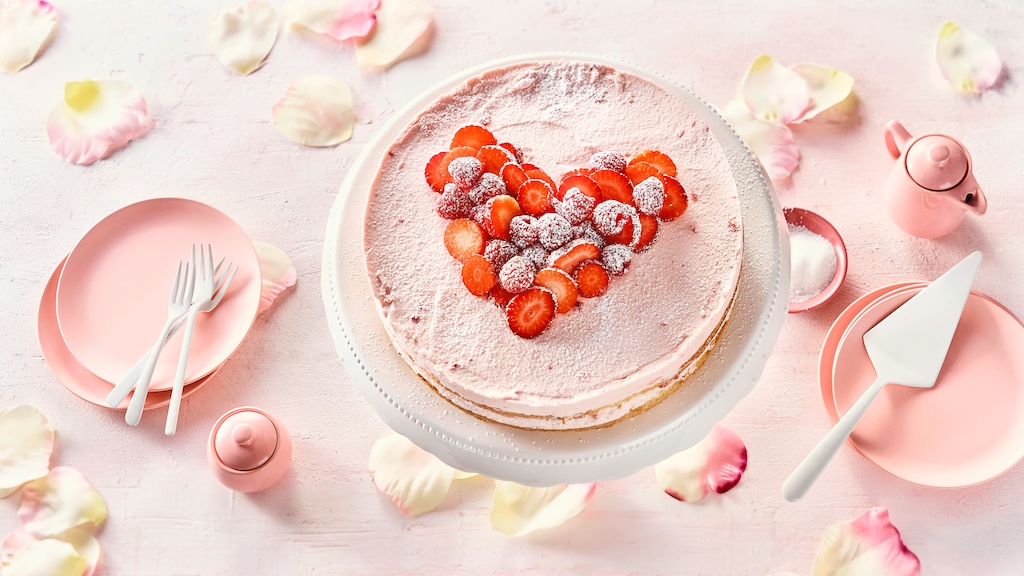 Für die Dekoration die Torte mit Puderzucker besieben. Die Beeren waschen, vorsichtig trocken tupfen und in Herzform auf der Torte anrichten.